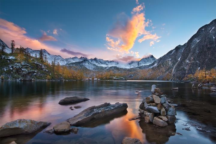 拍照的时候一定要透过湖水拍,因为湖水清澈见底,能倒影出对面山、树、蓝天的倒影~湖泊旁一株株红杉挺拨而遒劲,茂密而干练的针叶由绿变黄,公路两旁的落叶也是别有一番风味。
