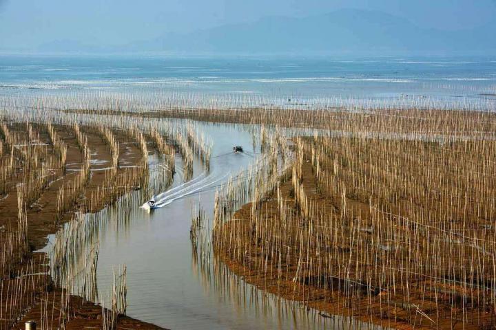 狭长斑驳的滩涂上,三三两两的散布着竹篙。