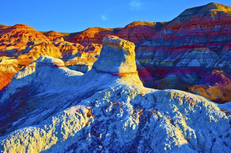 五彩城位于中国第二大沙漠古尔班通古特沙漠,因为那里亿万年来形成了煤层、沙层、矿层等,历经风蚀雨剥,日晒雷击,形成了以赭红为主夹杂着黄白黑绿等多种色彩的“雅丹地貌”。远望近观状如城堡。五彩城附近有近年来被外界颇为关注的卡拉麦里有蹄类野生动物保护区,自驾路上你可以沿途看到野驴、盘羊、鹅喉羚等野生动物。