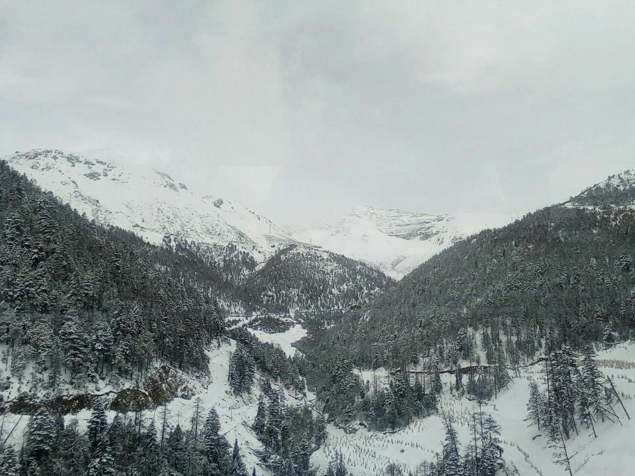 盘山公路爬上来是白马雪山,可以看见正面的一座山上还有一些白雪。上午在奔子栏,警察设卡拦车并告之白马雪山由于大风雪需封山,任何车辆不得通行,中午在东竹林寺附近再有警察设卡,但这回却说白马雪山可上,前提是必须四驱车或上防滑链的车才能上山,而且须