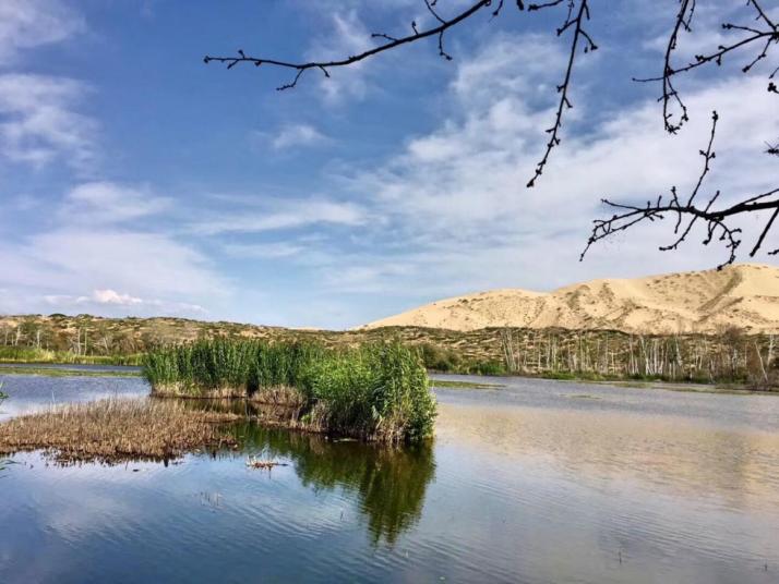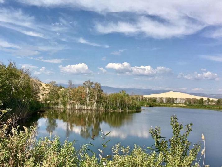 白沙湖位于哈巴河县西北侧的185团三连,是一处沙漠环绕的宁静湖泊。白沙湖外围有连绵起伏的沙漠,但湖边却绿树成荫,湖面水波粼粼,强烈对比的画面十分奇幻。每年秋季是游玩白沙湖最热门的时节,此时湖边的树叶都变成红黄两色,非常鲜艳,是拍摄红叶最好的地带。夏天时前来也很不错,湖中可以看到新疆少见的莲花开放。