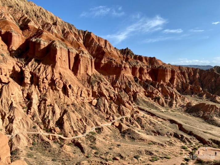 阿什贡峡这里的丹霞地貌以形象为主,据说天气适宜的情况下,色彩也是很好的。有土山也有石山规模都很大,气势也不错,但一早一晚都没有霞光,很遗憾。