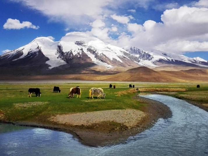 阿拉尔金草滩位于塔什库尔干县城东侧,塔什库尔干河两岸,占地面积20平方公里,属帕米尔高原上的一片湿地。不久前,塔什库尔干塔吉克自治县金草滩湿地公园景区旅游设施建设项目开工奠基,翻开了该县打造“北有喀纳斯,南有塔什库尔干”精品旅游县的新篇章。因有塔什库尔干河流经此处,这里水草丰美,牛羊遍地,和远处的雪山白云蓝天交融在一起十分漂亮。