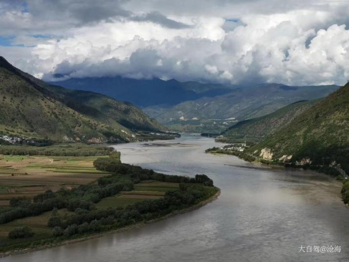 长江在长江第一湾这里一改之前与澜沧江、怒江齐头往南的方向,改为“滚滚长江东逝水”但这个地方不太好找,不是景点,在路边一家饭店后门进入山路,爬上这个第一弯对面的山岗上才能看的到俯视的全貌。