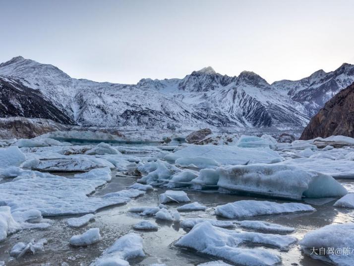 到了以后发现来古冰川和想象中的冰川一点也不一样,从观景台看,不是印象中与雪山连接在一起,而是在一大片乱石滩下面,冰块都漂在水上,看上去湛蓝湛蓝的