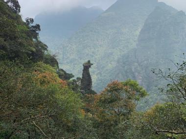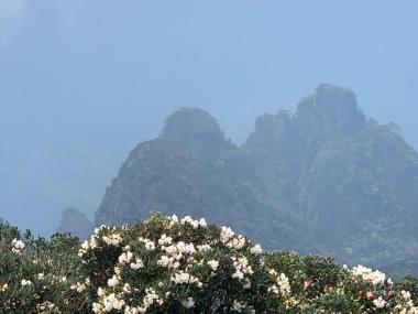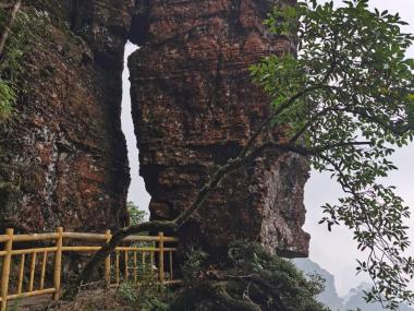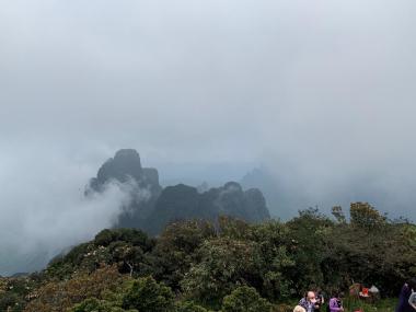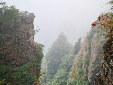 金秀大瑶山主峰圣堂山。为泥盆系紫红色砾岩和砂石组成,经自然力的作用和地表水长期侵蚀、切割、风化,崩解为丹峰挺拔、朱崖...