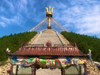 银肯敖包是由5.6吨纯铜铸造,象征56个民族以及上面雕刻的莲花图案在佛教中有着独特的象征意义。该敖包上端的杆子叫做玛...