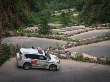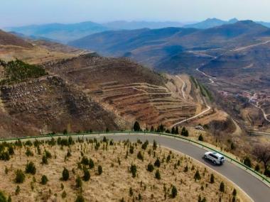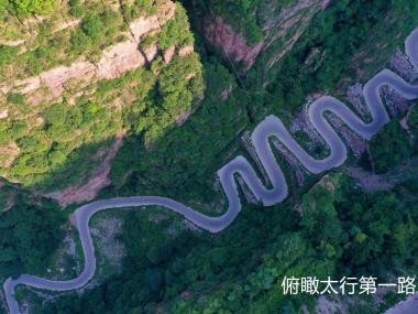 太行第一路是一段十六道弯的盘山路,从山脚至山顶的直线距离约300米,垂直高度约200米,在倾角约60°的斜坡上以“S...