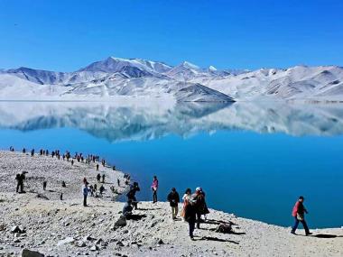 喀拉库勒湖位于“冰川之父”幕士塔格峰脚下,因湖水深邃幽黯,故名“喀拉库勒”,柯尔克孜语意为黑湖。湖水在阳光的照耀下,...