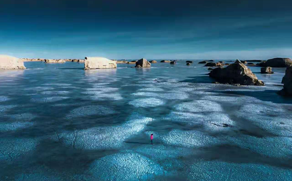 早餐后出发前往西台吉乃尔湖。湖面宛若镜面,颜色纯美剔透,淡青、翠绿、深绿的湖水使之如同镶嵌在戈壁上的双色翠玉,这样一块冰清玉洁的翡翠,为茫崖这个汉使张骞经过的丝路驿站和现实版的火星驿站增添了一抹似水柔情。下午我们将抵达世界上独一无二的雅丹地貌“水上雅丹”,雅丹群遍布于湖泊之中,而在冬季,这里的水面冻结,行程了更为罕见的【冰上雅丹】。冬日水上雅丹、千里冰封、没有夏日里阵阵浪涛声、纵使寒风凛冽、湖面也难起波澜、静谧蔚蓝的湖面像是一面镶嵌在雅丹上的镜子!映着天空中的晚霞、宛如置身于仙境!真是此景只有天上有、人间哪得几回见!从朝霞满天到日暮垂落都如梦似幻,夕阳余晖撒在水雅丹上,颜色金黄,这时的雅丹又像是一座座金碧辉煌的宫殿。简直壮美得无法用词汇去形容、只有各种惊叹各种拍,每个角度都是大片!