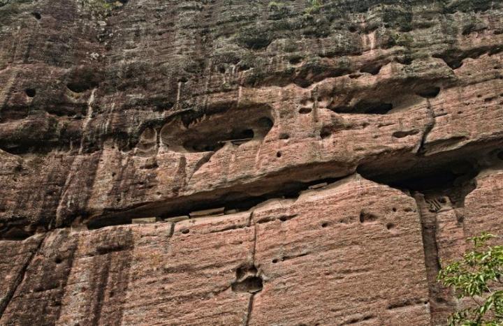 龙虎山崖墓群主要在仙水岩一带的悬崖峭壁之上。岩脚下便是泸溪河,从泸溪河舟中或地面眺望,隐约望见一个个岩洞口或钉木桩或封木板,有很多崖墓。据说这些崖墓大多是春秋战国时期古越人的崖墓悬棺。与三峡地区的悬棺有点类似。