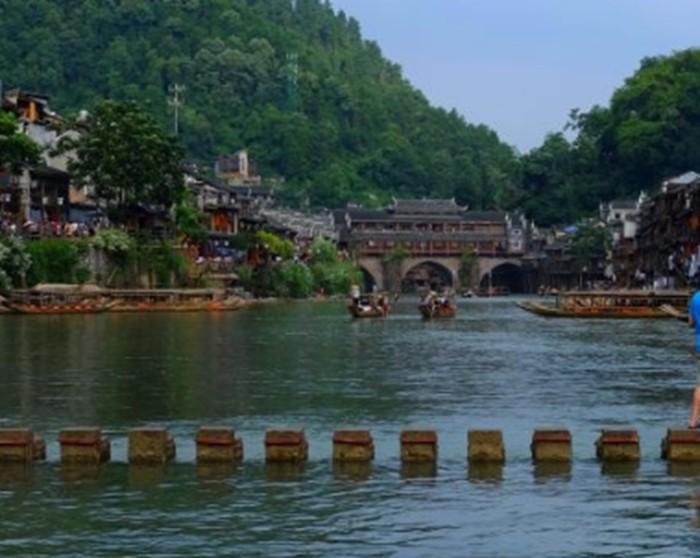 沱江“跳岩”,是湘西特有的交通方式,也曾是进出凤凰古城的主要通道之一。乾嘉苗民起义、辛亥革命凤凰光复起义、解放战争,这里都是进攻凤凰古城的主要通道。沈从文、黄永玉等文学艺术大家,也是从沱江的“跳岩”走向世界的。还有就是过跳岩一定要小心不要掉下去哦,特别是人多拥挤时,若遇“会车”一定要停下避让,谨记安全第一!女生还是尽量穿平底鞋吧,出门旅行若穿个高跟鞋会“自讨苦吃”呦!沱江下游也有一个很大的跳岩,若因人过多怕拥挤而不敢走上游的上下两个跳岩,可试一下下游的那个呦。其实很多苗宅也会有较短的跳岩,可以去蹦达一下拍个照也不错呢!