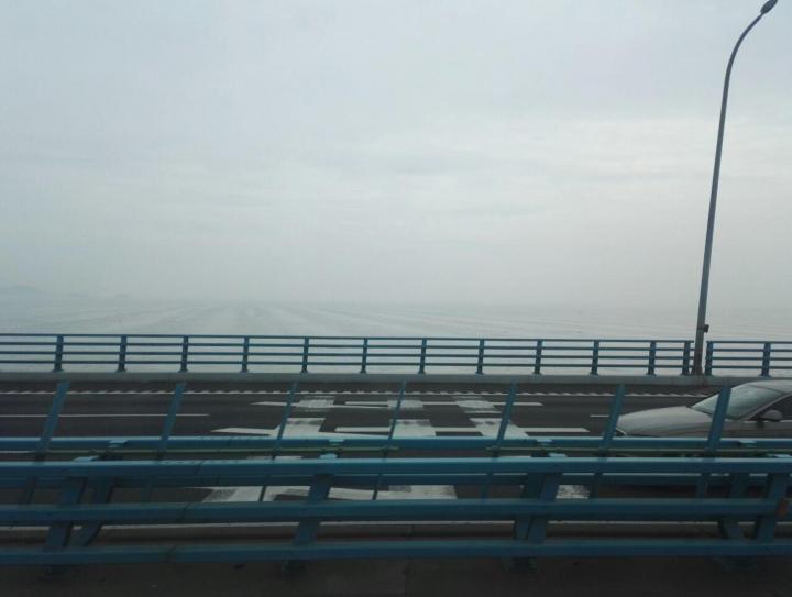 从乌镇到舟山岛的旅途特地选择从杭州湾跨海大桥通过,好一睹风采。路过时能见度不高,在20多公里的行程中,窗外海天一色。由于错过中途停靠点入口,所以没能仔细观赏大桥英姿。比选一下,从杭州湾大桥比陆路要贵50元左右。