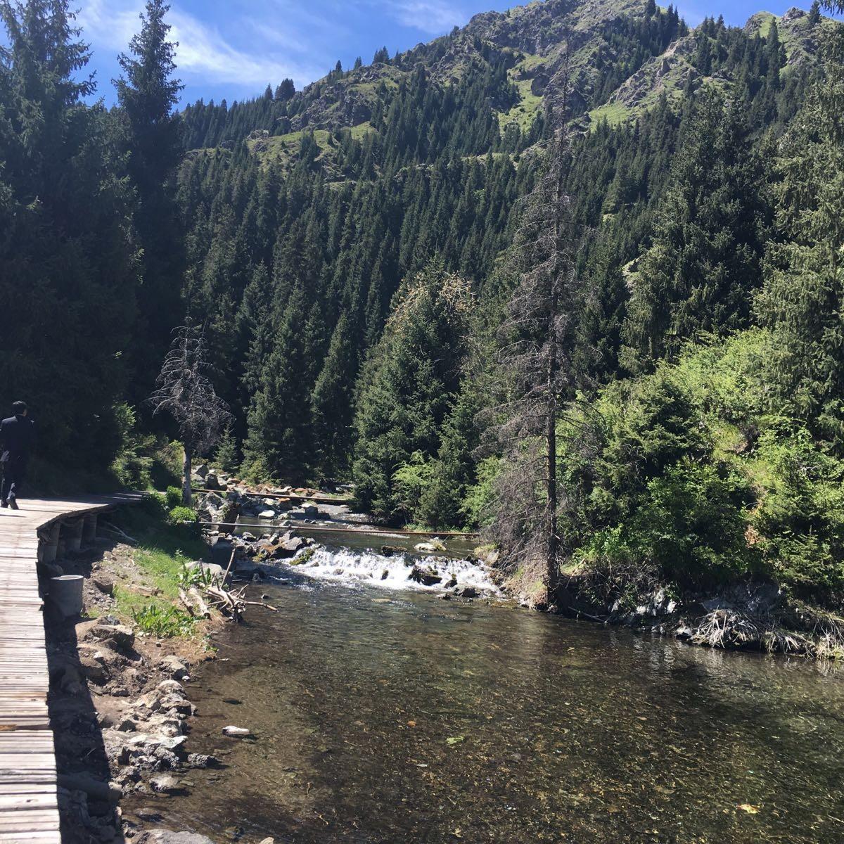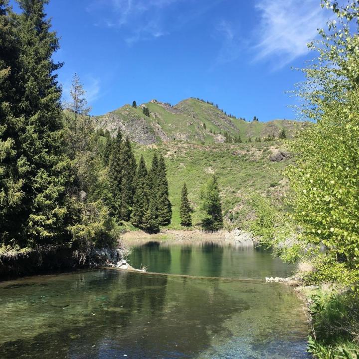 5月去天山天池游玩,图片是西小天池,西小天池在天池脚下两公里处的路旁,水面状如满月,池水清冽幽深。天山塔松环抱四周,池中有松树的倒影。