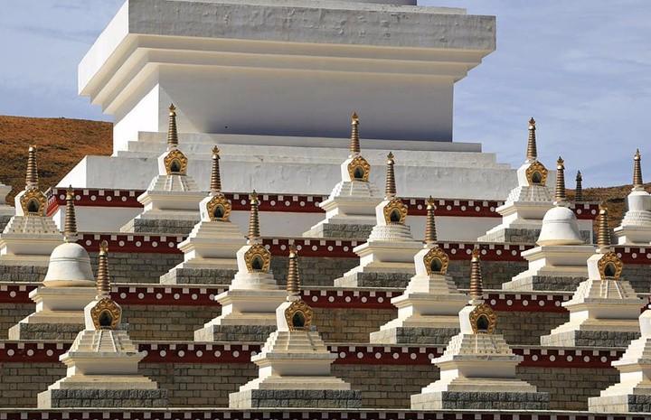 尊胜塔林在稻城有着特别重要的地位,在稻城人心里它堪比一座神圣的寺庙。去稻城路上就能看到它,很远就能看到,它周围都是空旷的草原,一座白色的建筑物坐落在那,顶部是金色的。在空旷的草原上,在碧草蓝天下,这简直是一副美不胜收的童话画面。白塔很多当地人叫它“胜利塔”。