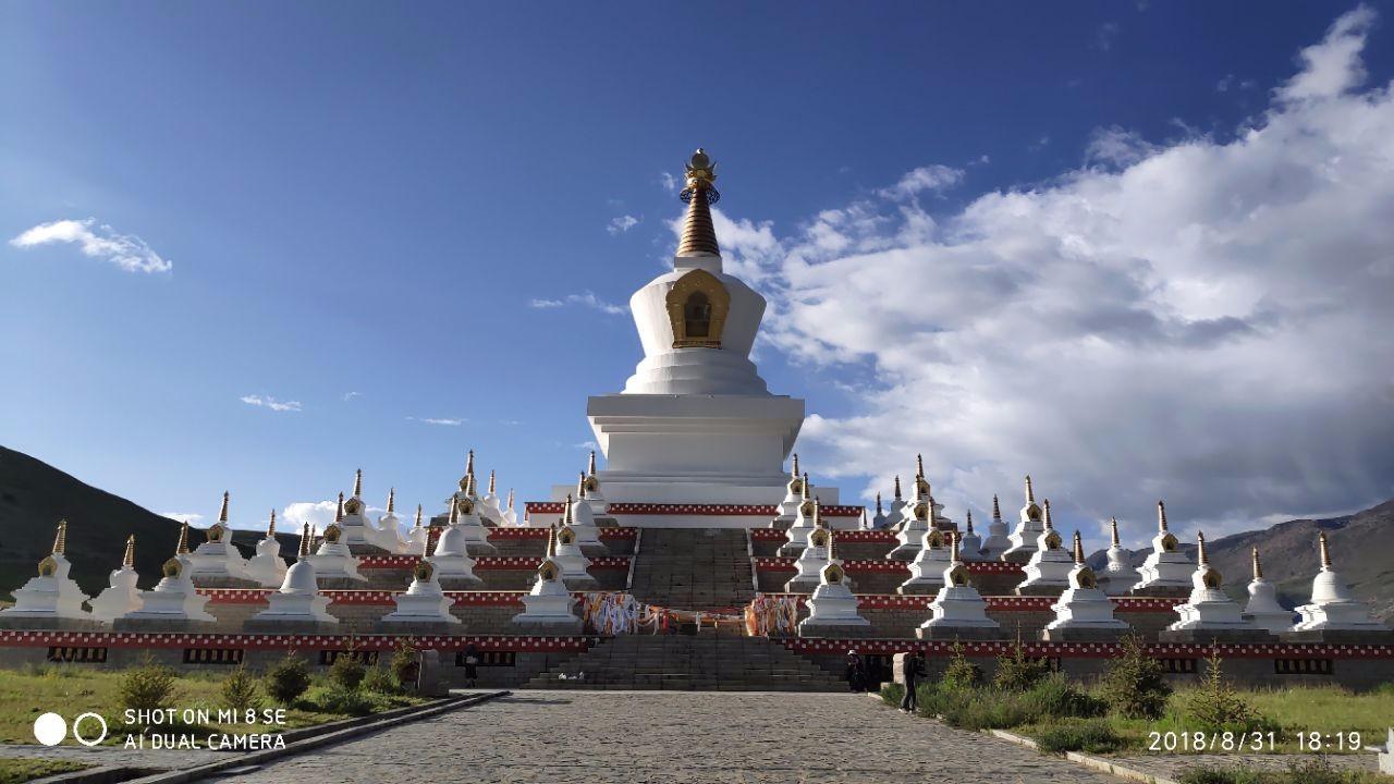 尊胜塔林在即将到达稻城的路上,共五层,最高层中央为一个高大的白塔,周围排列四层小白塔,从上到下每层依次有15、23、31、39座塔,共108座小白塔,很是壮观。