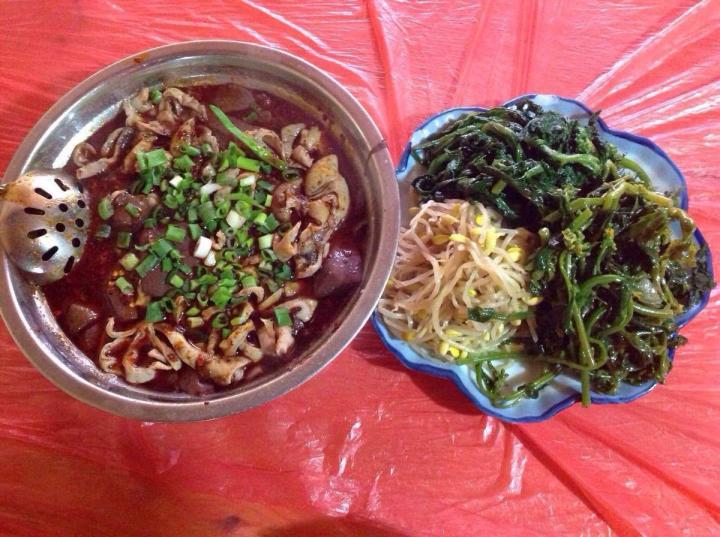 来新场古镇是奔着一种小吃而来。这种小吃你可能没吃过,但是应该听到过。川菜--毛血旺。它的原始出处就在新场古镇。小吃店随处可见,最正宗的为周家毛血旺。听说有成都人在周末专门到此品尝。想必前来的游客多是为此而来。 正餐必须要品味周家毛血旺。应该是名声在外