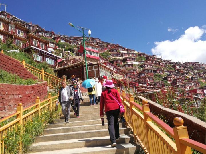 色达五明佛学院当地人有「色达山河一片红」的说法。这里的僧舍很壮观,连绵数公里的山谷布满了密密麻麻的小木棚屋。谷底和山梁上分布着几座寺庙和佛堂,建筑规模虽都不很大,但装饰考究而辉煌;身披桨红色僧袍的喇嘛和尼姑来来往往,空气中充满生机和祥和气氛。