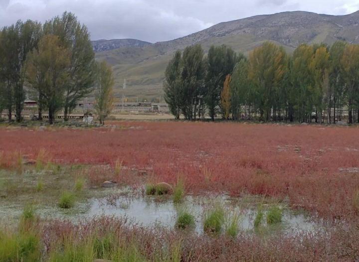 甘孜州稻城县桑堆乡的红草地,极目远望,一片红彤彤的景致映入眼帘。现在桑堆小镇的红草地已经被一段很小的围墙围了起来,收取门票10元/次,10月中旬是红草地最美丽的时间,运气好的话,你可以拍色下几种色彩!