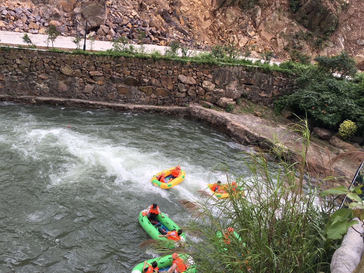 召贡峡漂流全长5公里, 主峰海拔高度1337.3多米,共168个落差,总落差高488米,分两种漂,全程漂约2.8小时。召贡峡漂流河道落差大,水流急,弯道多,高潮不断,峡谷内,高滩大跌,石岩无数,刺激、惊险、安全好玩。全程漂168个落差中包含了33个大的落差,落差长度较大处达500米,落差高度较大处达100米。下游河道勇士漂欢乐刺激,有各种滩跌洄潭,约漂1.5小时,共有68个落差,落差长度较大处达300米,落差高度较大处达80米。