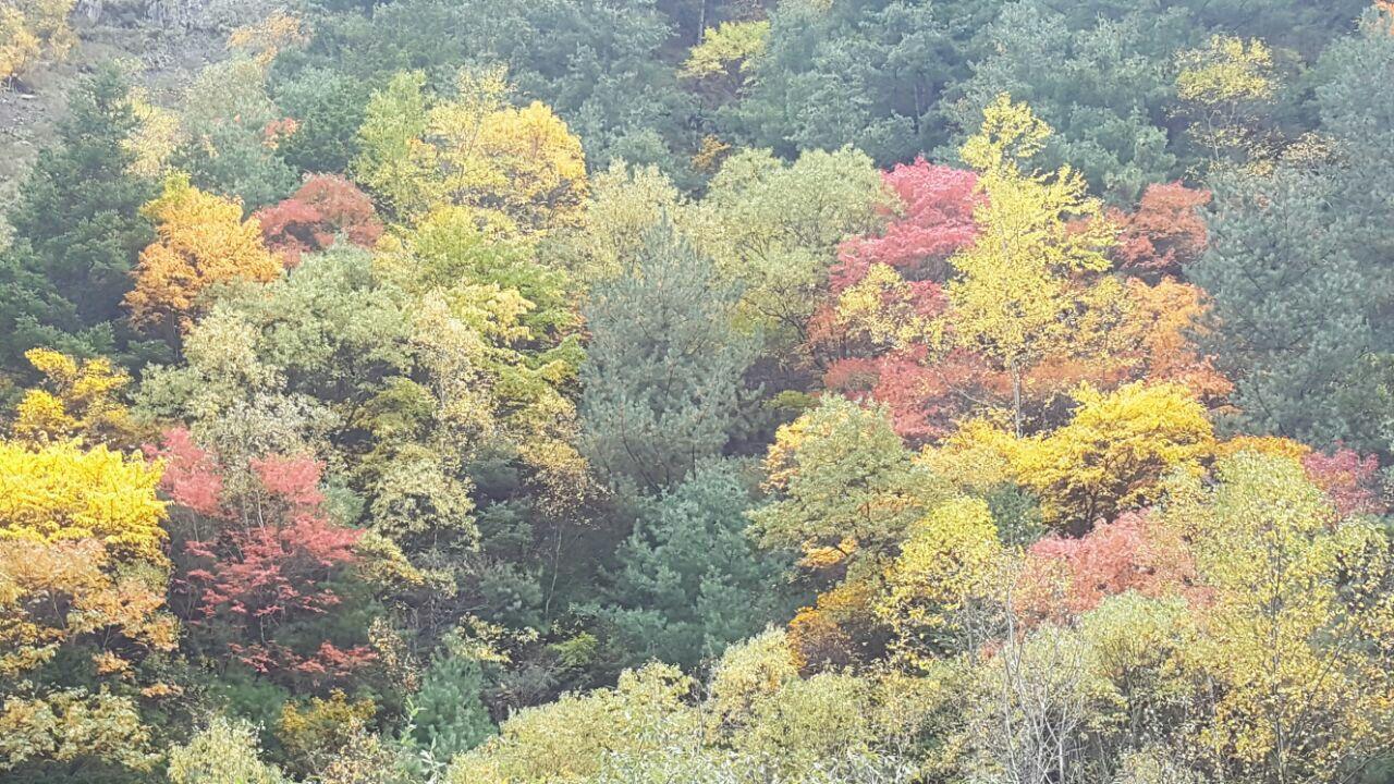 “奶子沟”最著名的便是秋天的彩林风情谷,在纯净的蓝天底下,紫红、粉红、橘红、金红、深黄、草绿、黄绿、棕红、褐色的树木形成了“万类霜天竞自由”之势。