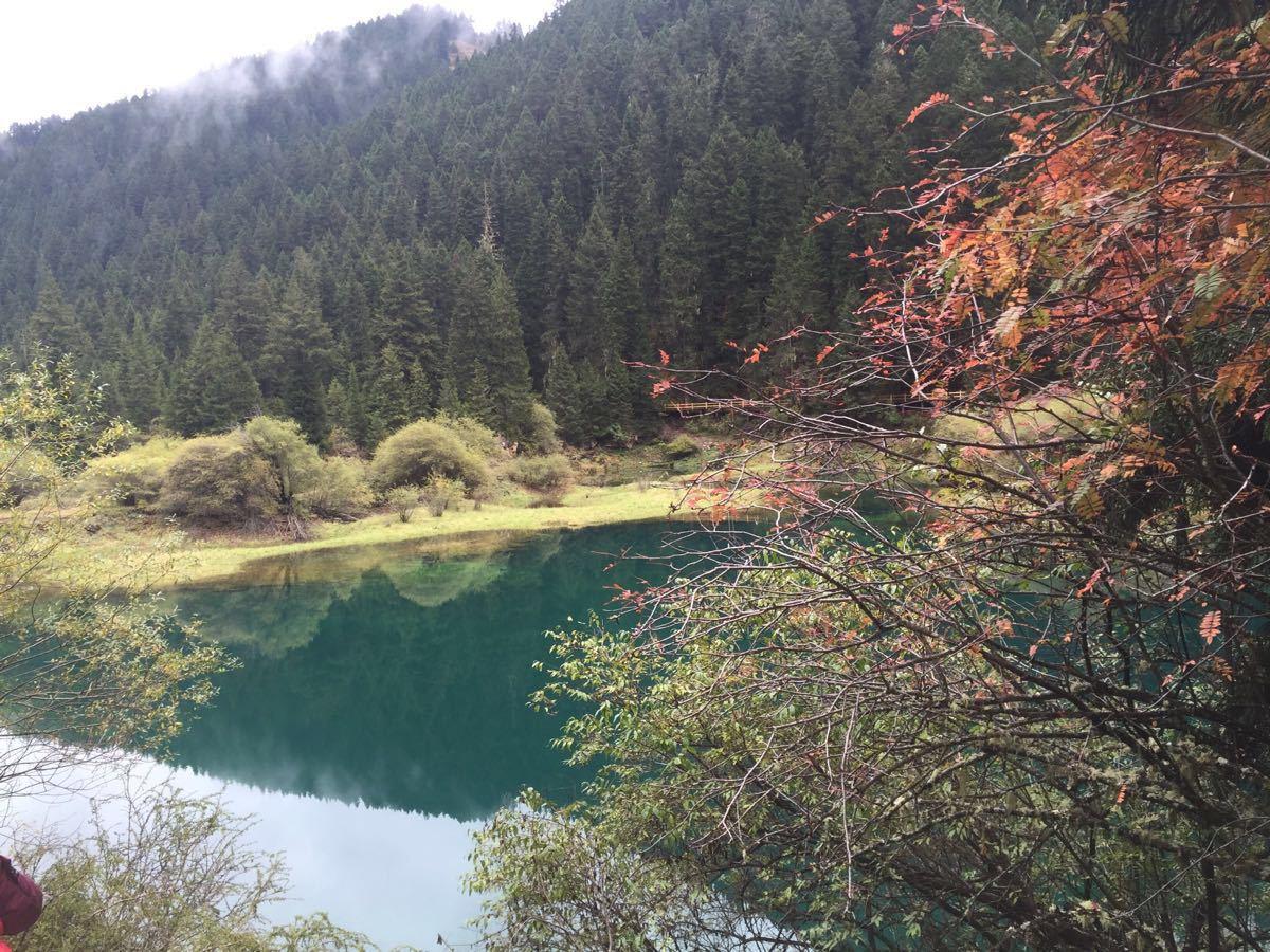 如油画般的树木铺展开来,像是一块层次鲜明的画布,围绕着脚下的一汪碧蓝。