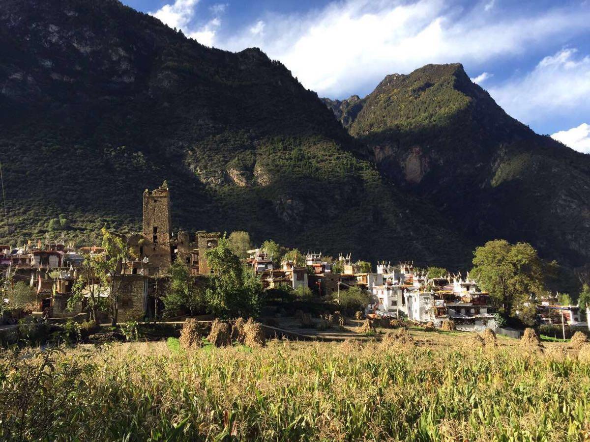 与山谷、溪流、雪峰一起,将田园牧歌式的画卷展示在人们眼前秋季的彩林在清晨柔和阳光的映染下愈发鲜亮斑斓,丰收后的田地中垒起了垛垛秸秆,高耸的碉楼与白色的藏居错落有致地散落在峡谷谷地中。