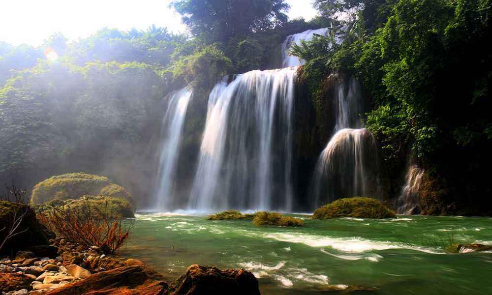 沿河两岸群山环绕,绿树繁茂,瀑布倾泻而下,形成迷人的自然景观。呼吸着清新的空气,吹着凉爽的风,自在惬意。
