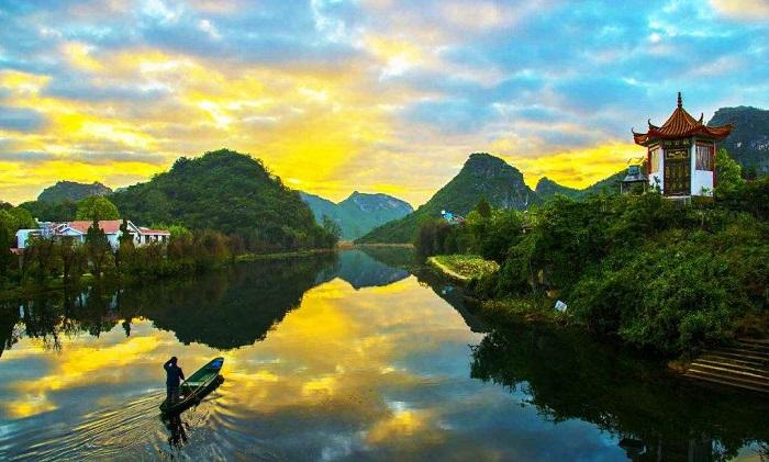 坝美村位于云南广南县北部,属喀斯特地貌,四周被翠绿的群山环抱,境内一年四季流淌着一条名为“驮娘江”的清澈小河。这个村寨的神奇之处就在于,进出村都需乘船经过幽深、昏暗的水洞。