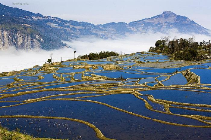 在元阳有一块著名的蓝梯田,因位于爱春村而得名,爱春梯田与其他梯田有所不同,梯田全是蓝色,这不是因为梯田的水是蓝色的,而是因为梯田是天空的镜子,梯田的水映衬了天的蓝色,天光云影共徘徊,水天一色,十分好看。