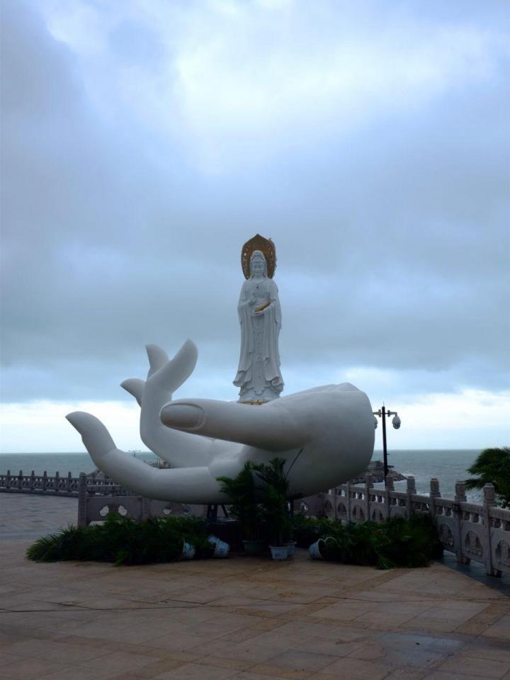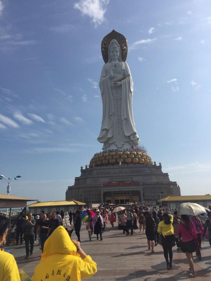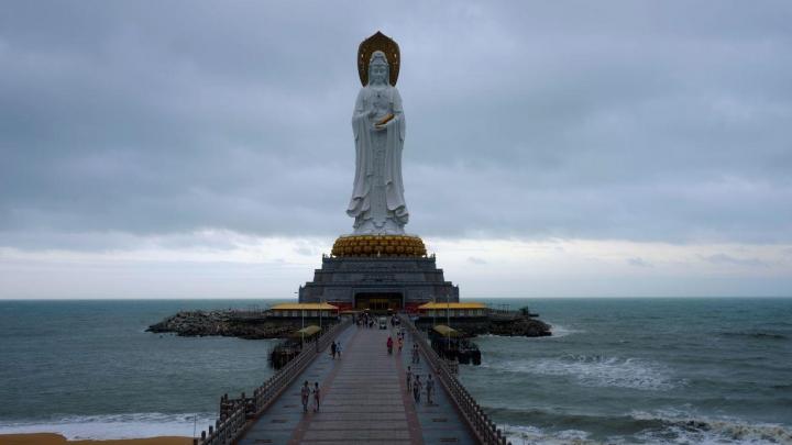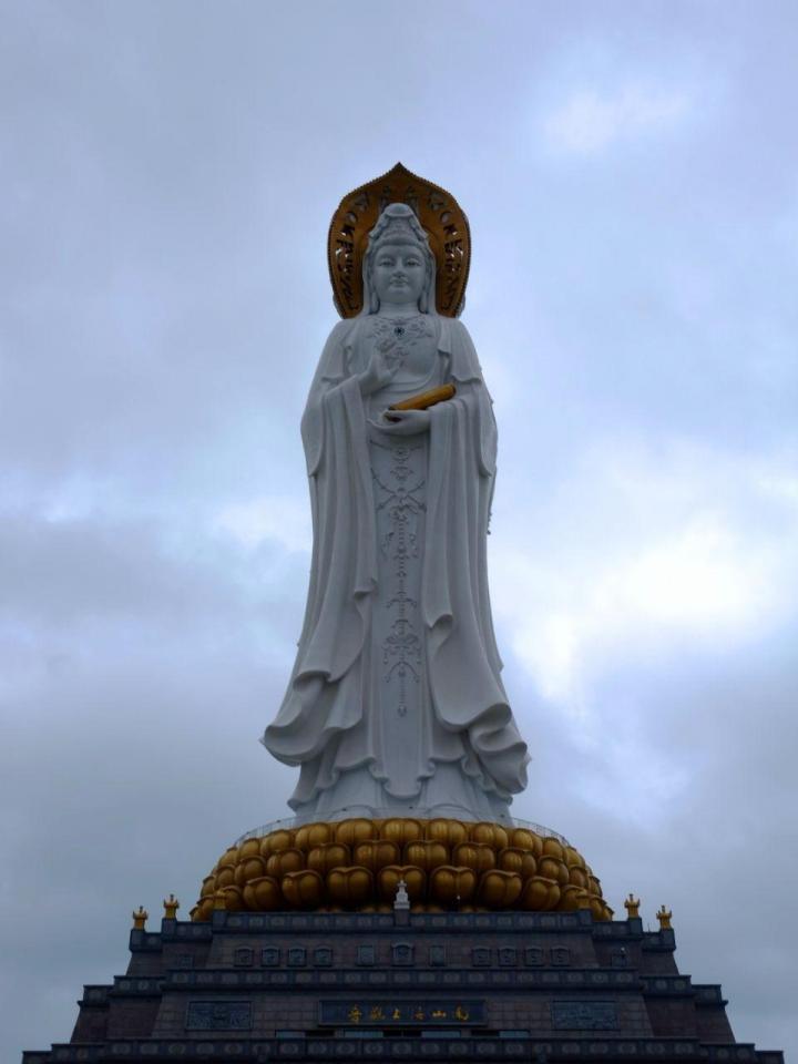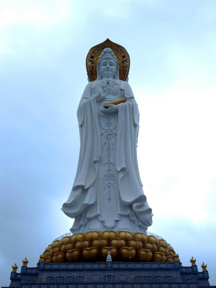 南山海上观音圣像高108米,凌波伫立在直径120米的海上金刚洲(观音岛)上。观音圣像雄伟壮观,面容庄严神圣,屹立于南海之上,守护和祝福着国家的繁荣富强!金刚洲由长280米的普济桥与陆岸相连,并与面积达60000平方米的观音广场及广场两侧主题公园,共同组成占地面积近30万平方米的“观音净苑”景区。