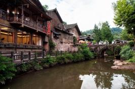 水磨古镇位于四川省汶川县南部的岷江支流寿溪河畔,是当年汶川地震中的一个重灾区,而如今重建后变成了一个独具特色的旅游景点,可以体会到浓厚的羌族文化。成都出发的游客可以在茶店子客运站坐大巴到达景区,景区内有羌族风情的