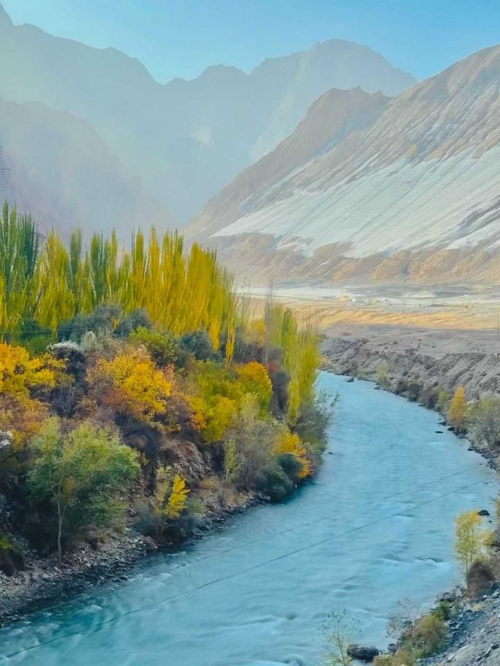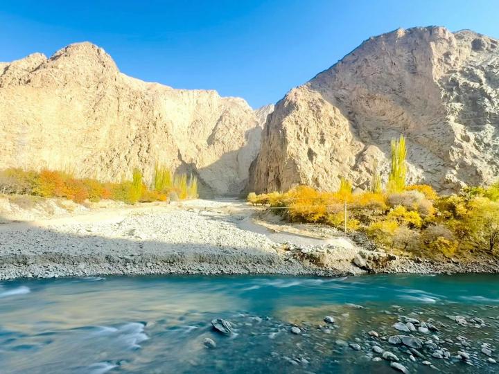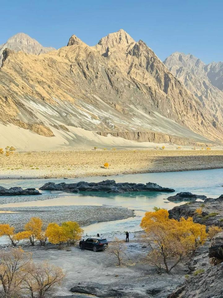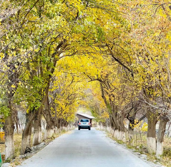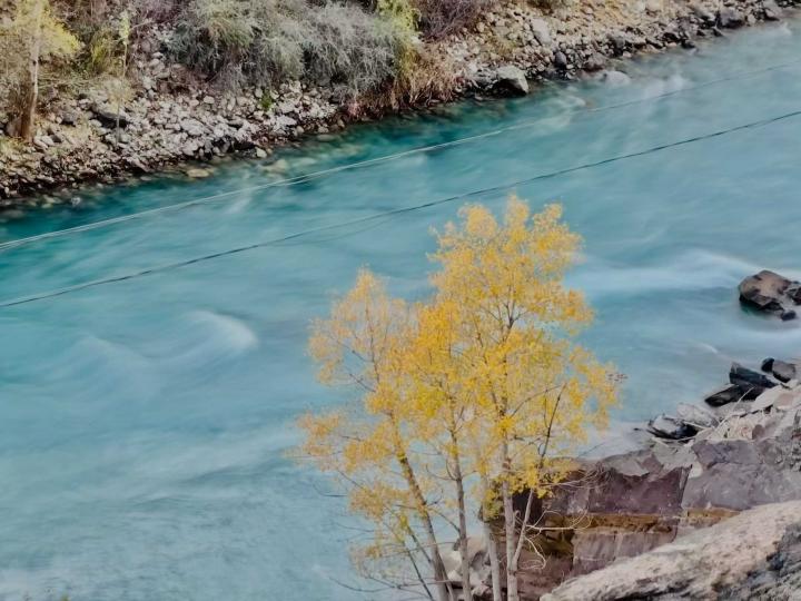 峭壁赭红,叶尔羌河蓝若宝石,杏叶,胡杨,白杨交织着赤金与绯红,恍惚间仿佛与千年前玄奘东归擦肩而过。