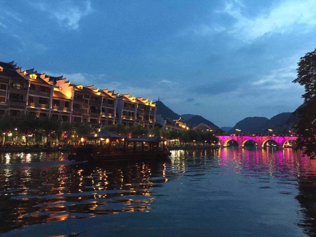 祝圣桥是古镇的地标,桥上有一座三层的亭子,这里曾是湘黔联通的主要通道,自古既有“湘黔咽喉”之称。每天晚上,祝圣桥上灯火通明,河水倒映着灯火,颇为壮观,无论是桥上闲逛还是拍照休闲都很适宜。祝圣桥头东侧是玉屏山,40多座明清古建筑依山而建,层层叠叠,颇为壮观。这是镇远古镇不可错过的一个地方:青龙洞。这些古建筑依山势而建,与悬崖、古树、藤萝、溶洞融为一体,浑然天成。穿行期间,有回到古代的感觉。最顶部的玉皇阁的镇远古镇的最高点,这里也是拍摄古城全景的最佳位置。从祝圣桥走一圈下来,差不多要一小时。青龙洞单独售票,门票60元。