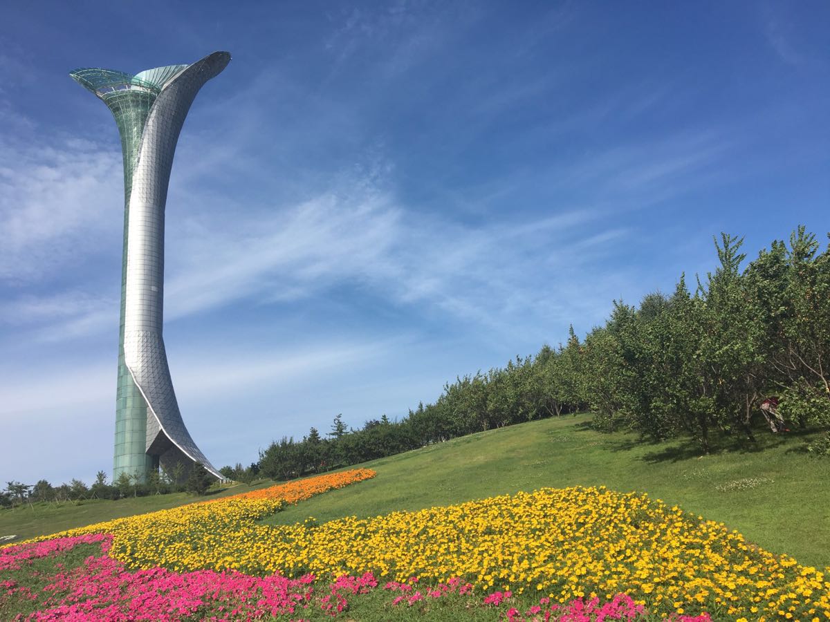 世博园的东端建有一座一百多米高的观光塔,形似一支挺拔的百合花,入塔可乘坐电梯至观景台,整个园区的美景尽收眼底,甚至可远眺棋盘山与沈阳城。园内环境宜人,很多新人来此拍摄婚纱照,园区西部还建有婚姻殿堂,有时能看到新人在这座欧式礼堂中举行婚礼。