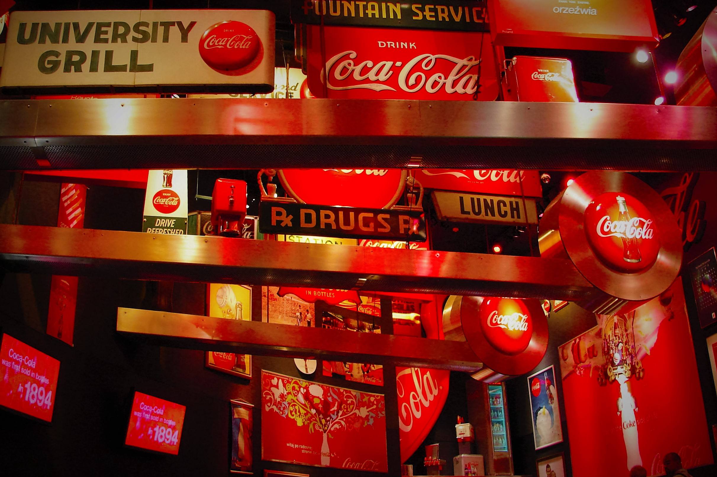 穿过一台由老式可口可乐自动贩卖机改装的大门,进入观光通道。仅隔着透明玻璃,可口可乐的流水线车间展漏无疑,墙上的海报展示着可口可乐公司的珍贵回忆——例如1927年上海虹口的可乐装瓶厂等。