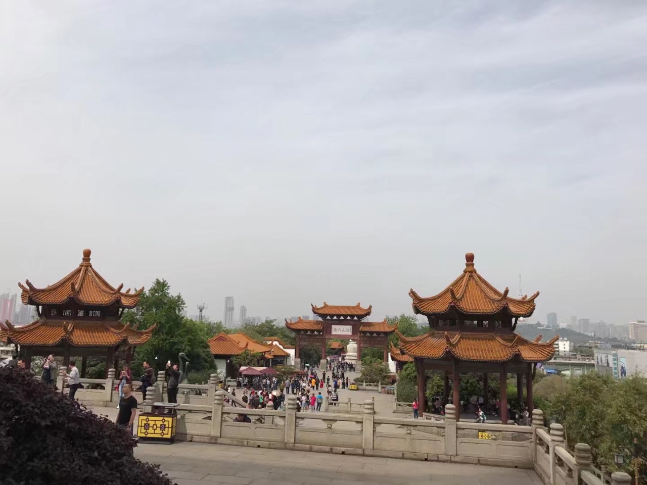 巍峨耸立于武昌蛇山的黄鹤楼,享有 " 天下绝景 " 的盛誉,与湖南岳阳楼,江西滕王阁并称为 " 江南三大名楼 "。全楼各层布置有大型壁画、楹联、文物等。楼外铸铜黄鹤造型、胜像宝塔、牌坊、轩廊、亭阁等一批辅助建筑,将主楼烘托得更加壮丽。登楼远眺," 极目楚天舒 ",不尽长江滚滚来,三镇风光尽收眼底。黄鹤楼的形制自创建以来,各朝皆不相同,但都显得高古雄浑,极富个性。与岳阳楼、滕王阁相比,黄鹤楼的平面设计为四边套八边形,谓之 " 四面八方 "。这些数字透露出古建筑文化中数目的象征和伦理表意功能。
