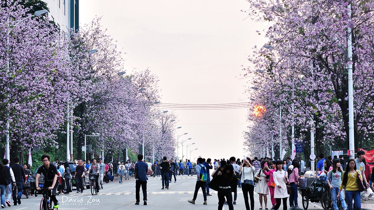 三月紫荆开,人民北路的紫荆花迎风飘扬,不时落在过往的行人肩上。