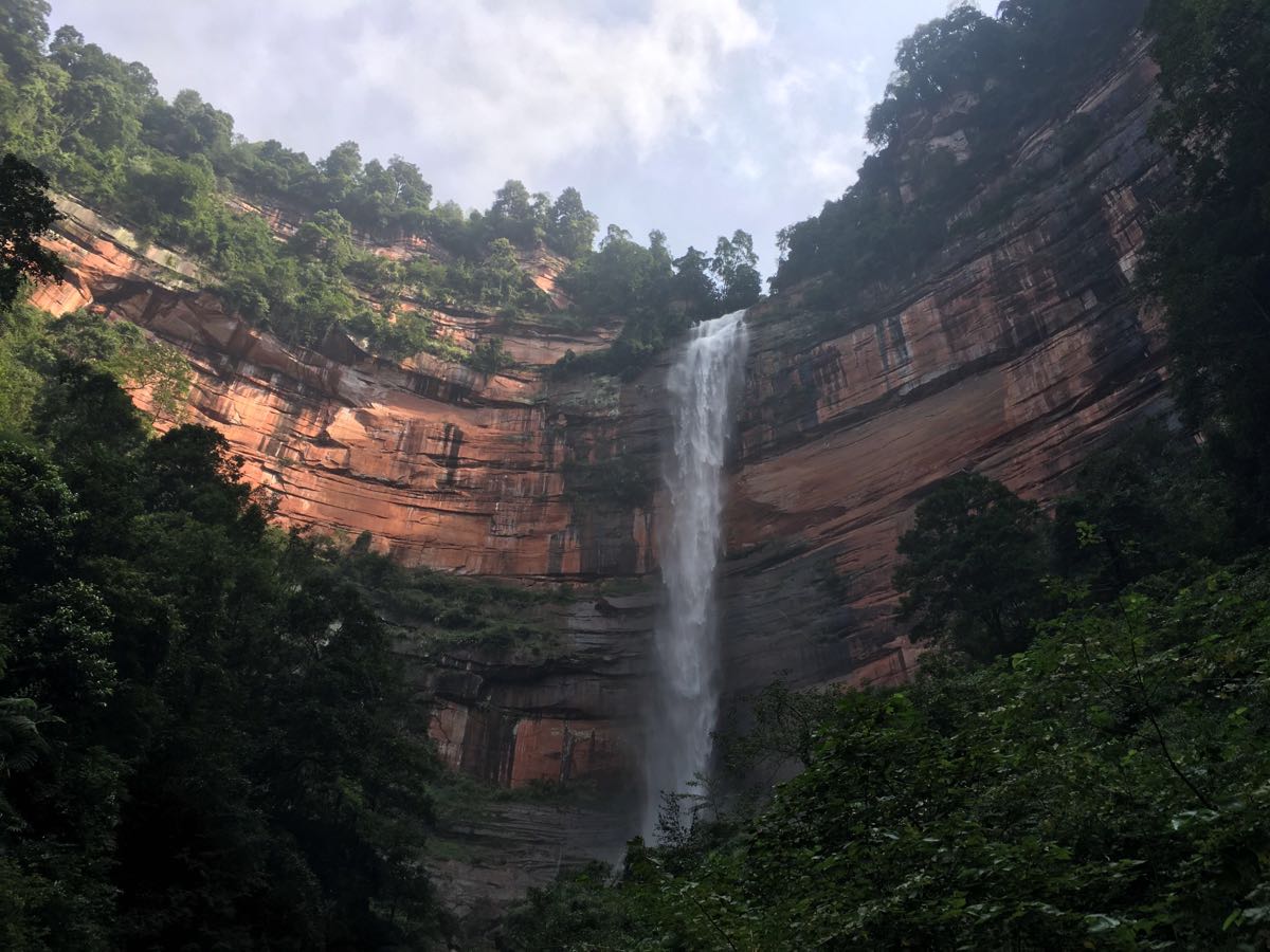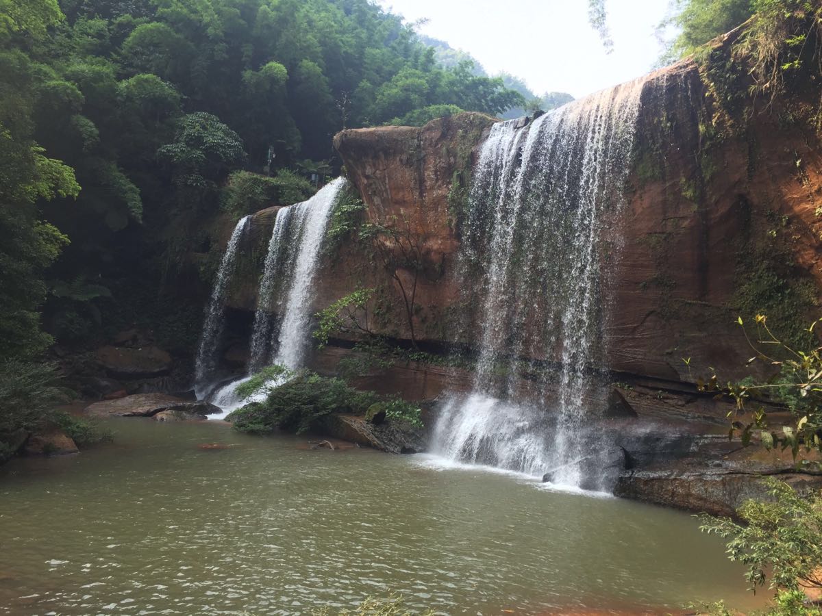 步道的路上可以一路欣赏丹霞地貌,呼吸新鲜空气。走到底就是赤水大瀑布了,壮美的瀑布倾泻入潭水,溅起的水花晶莹剔透,发出的瀑布声轰鸣震耳,运气好的话在阳光下还能看到彩虹。攀上潭水中的巨石,就能近距离感受瀑布。"