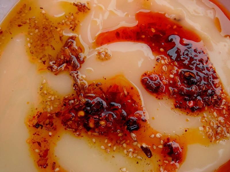 稀豆粉是用黄豆吊浆液制作而成,原浆要分别制成清浆和浓浆两种,最后再用两种浆制成稀豆粉。腾冲稀豆粉的吃法也很讲究,一种不加任何佐料直接吃,可以吃出黄豆的本味,一种加佐料拌着吃,有佐料的酱香和黄豆的清香,实属美味。