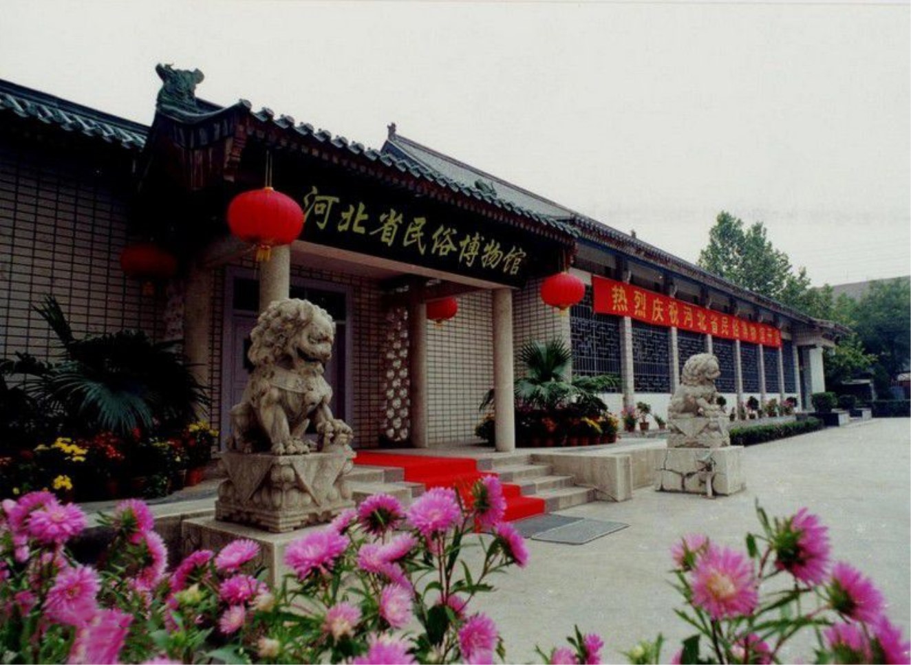 河北省民俗博物馆的建筑结构遵守传统规矩,东南西北四排建筑首尾相接,形成了明清时期南方庭院的“口”字形模式。房顶呈状如山脊的“歇山式”,窗户为传统的如意造型。再加上房顶高高翘起的飞檐上蹲着的“镇角兽”、大门口威武的石狮子、红红的大灯笼,和展厅墙壁上“万字不到头”的装饰图案,以及柱子上象征长寿吉祥的“连绵寿字”。