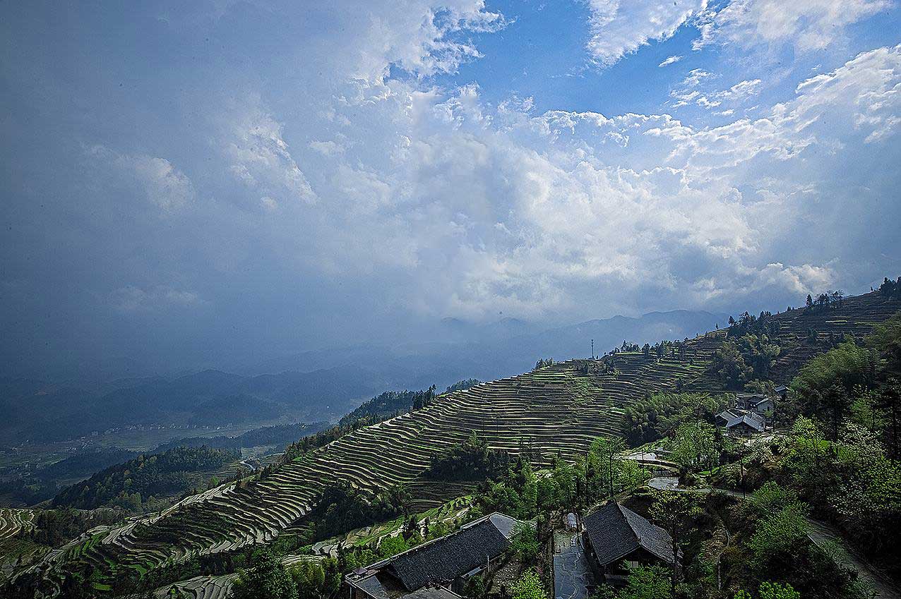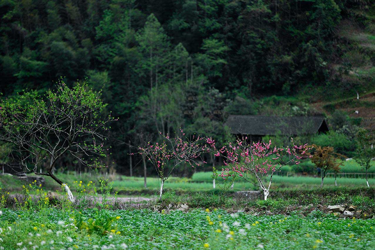 新化县奉家镇似乎是一个与世隔绝的“桃花源”。大山连绵,满眼青翠,道路两旁,一边是高山,一边是溪流,古朴的板屋点缀在春天的绿色里。高山上的大片茶园正葱翠着,还剩下最后的一点春芽,等你来采摘。