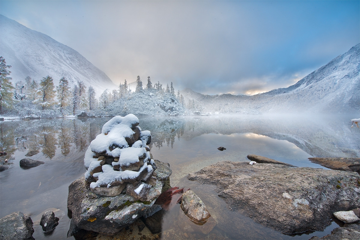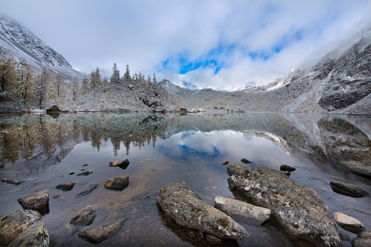 拍照的时候一定要透过湖水拍,因为湖水清澈见底,能倒影出对面山、树、蓝天的倒影~湖泊旁一株株红杉挺拨而遒劲,茂密而干练的针叶由绿变黄,公路两旁的落叶也是别有一番风味。