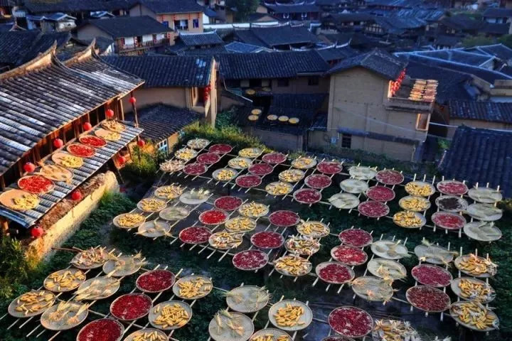 家家户户屋檐下晒满了稻谷、玉米、辣椒等色彩鲜艳的农产品,与白墙黑瓦的明清民居构成了一幅完美秋收画卷。