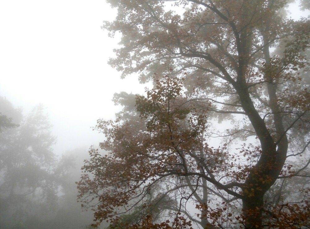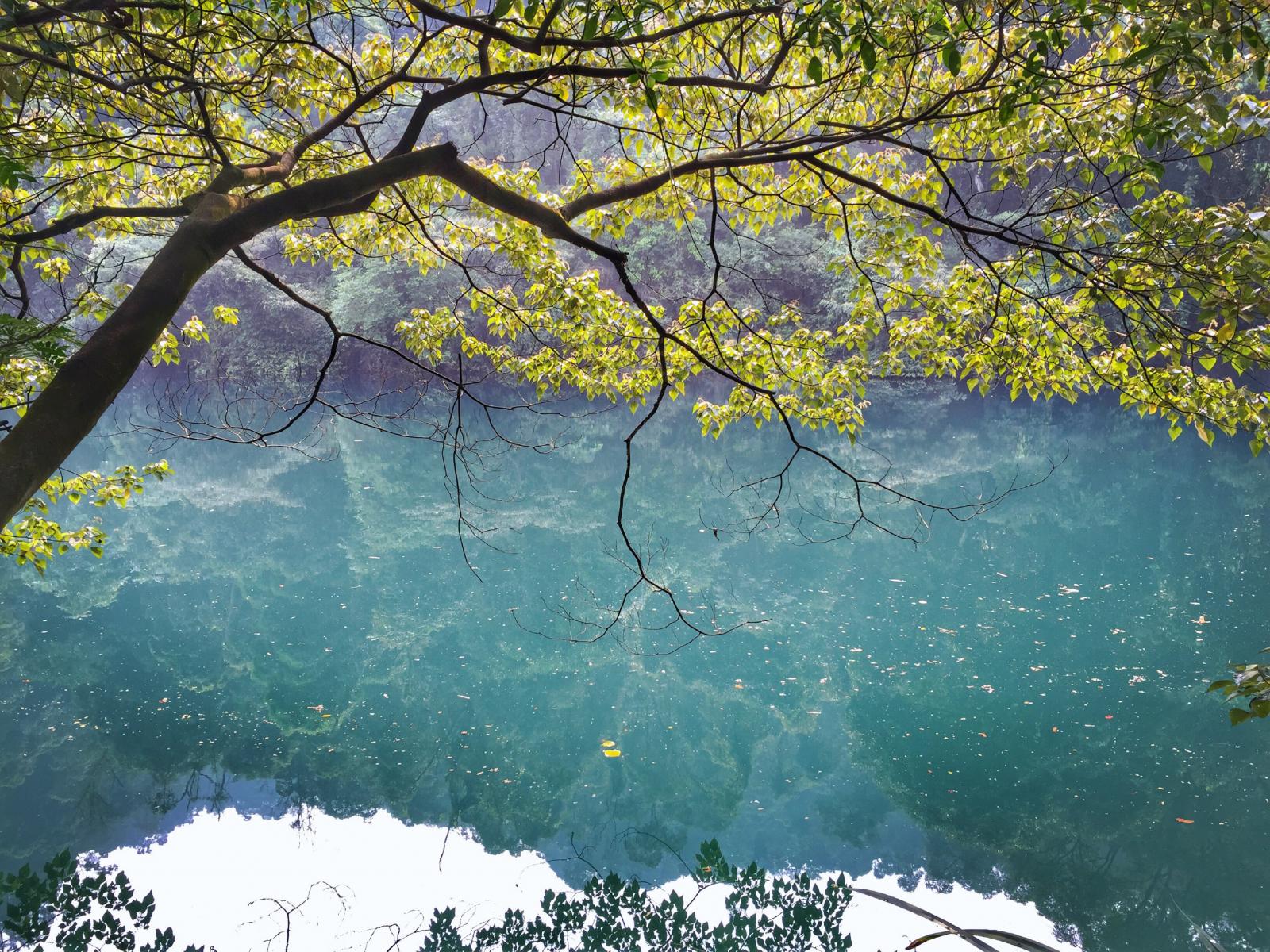 石门幽谷里的枫香树尤其出彩!夹溪而长的枫香树,每一株都是特别的,有的叉枝伸过此岸,有的弯身探过彼岸。秋风飘过,红叶或是飘落在淙淙的溪水中,随波逐流;或是映在飞瀑下的深潭中,染红那片幽碧。