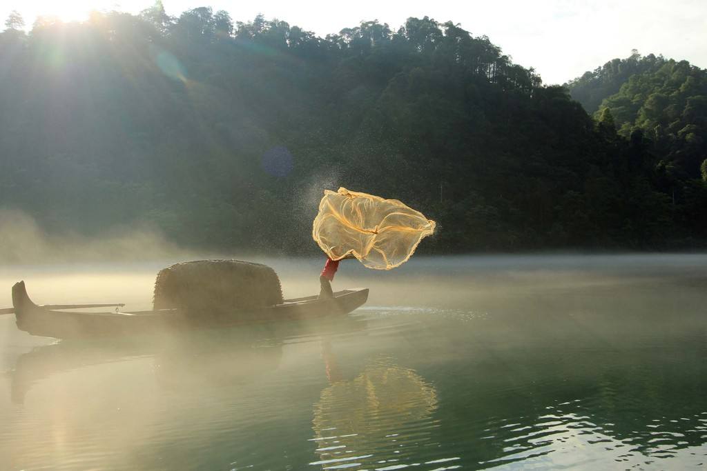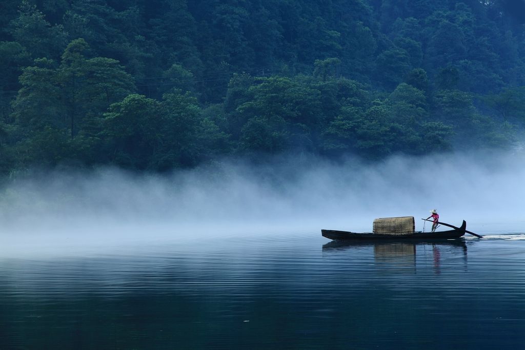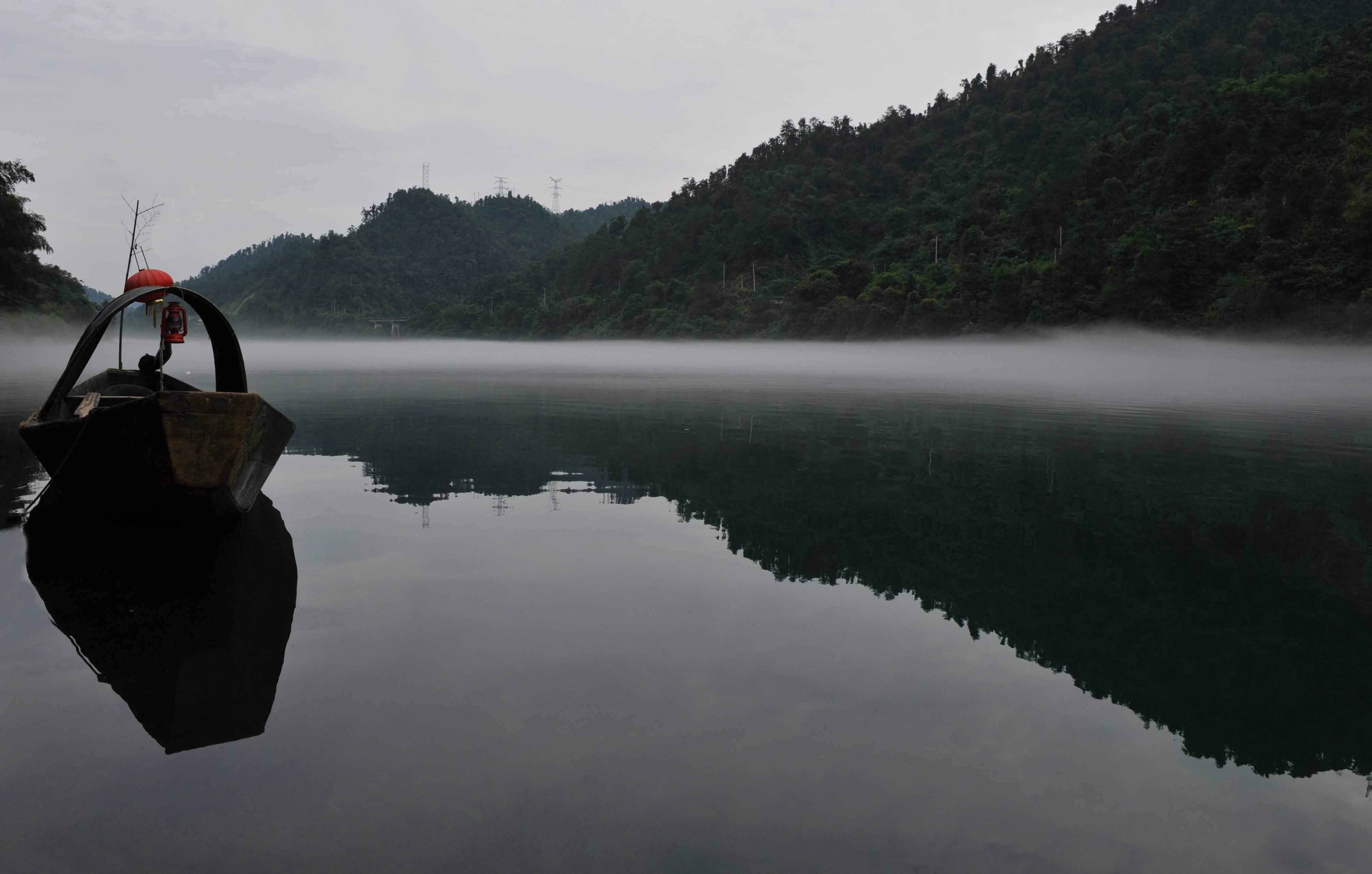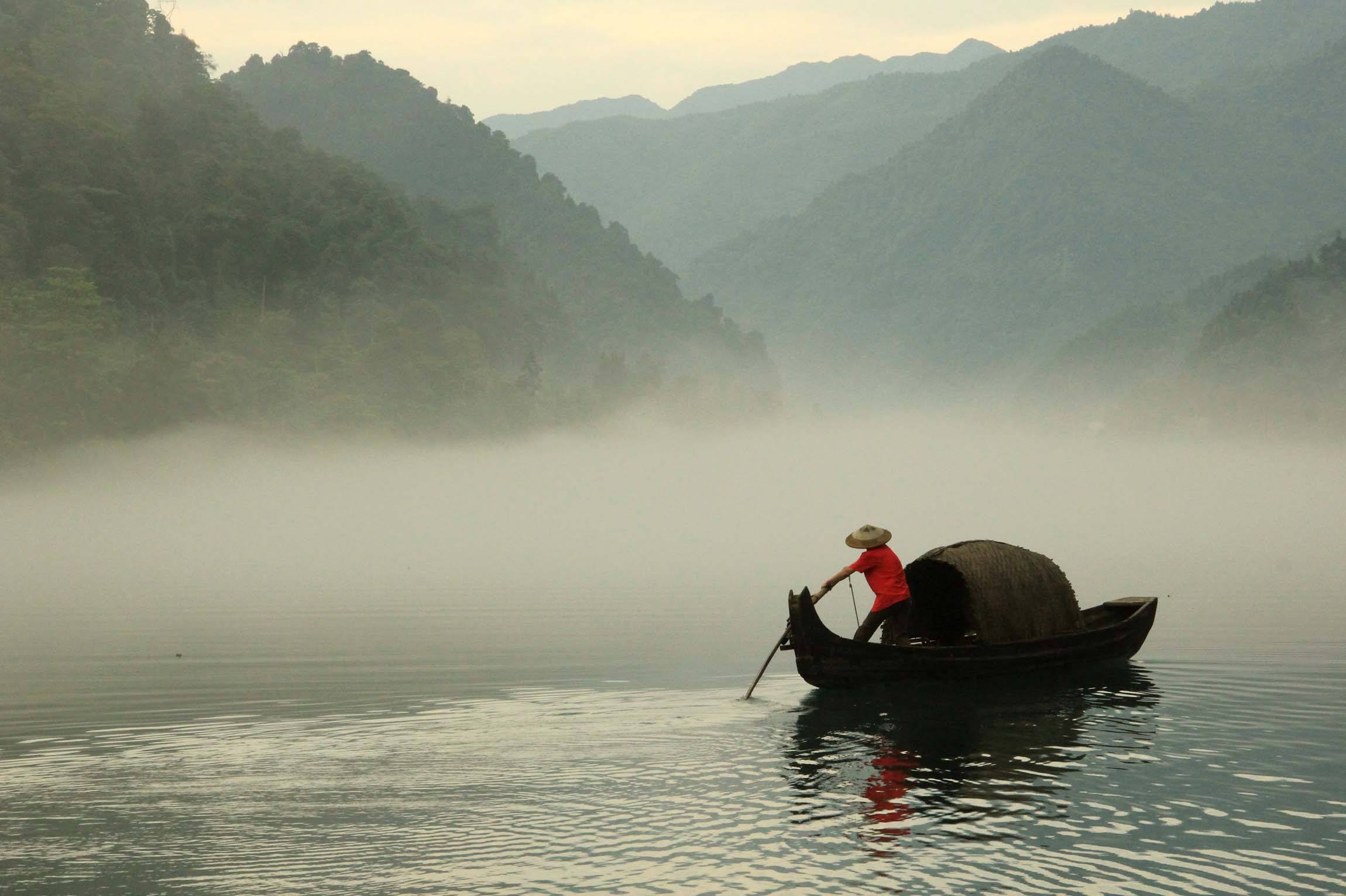 云雾萦绕山间,一叶小舟飘在江面,静如止水,又震撼心灵。