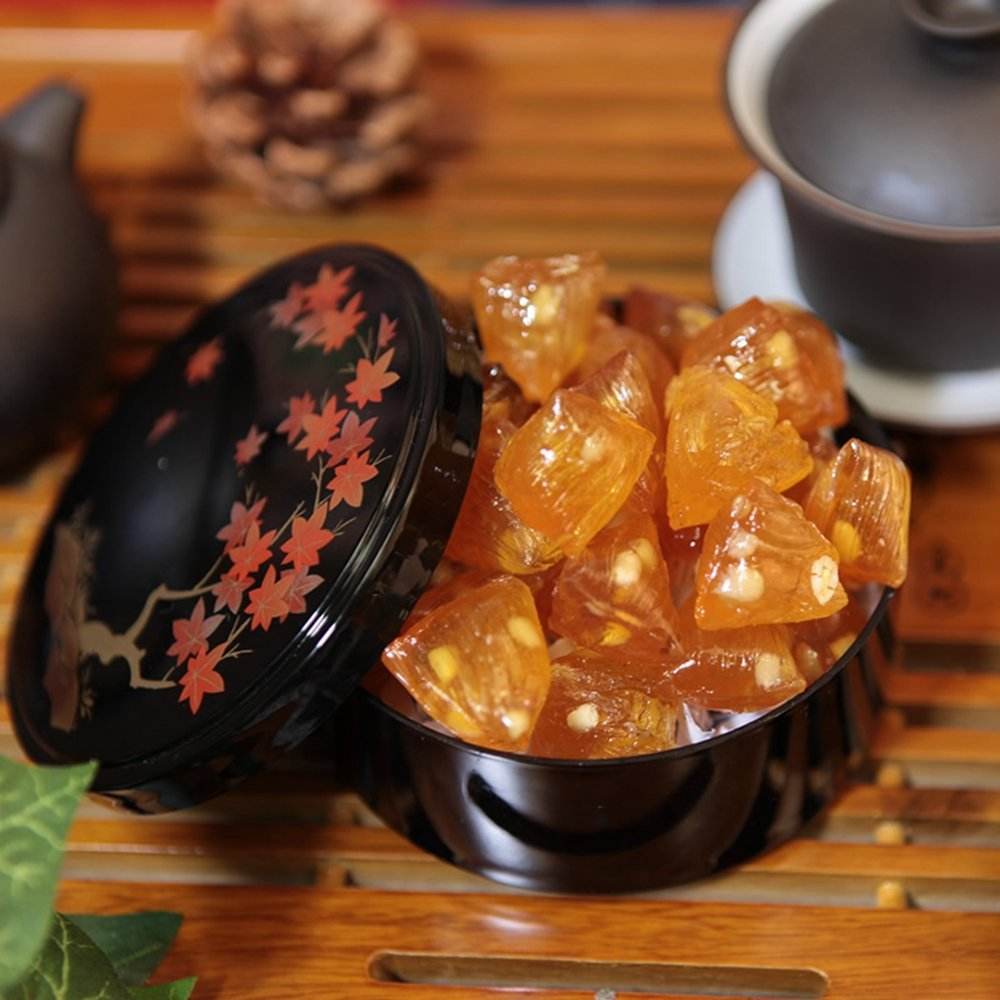 粽子糖是姑苏特产,可算是世上最美丽的糖了。琥珀色的麦芽糖汁凝成一颗小小的“四角粽”,晶莹剔透,似有一丝淡淡的粽香入鼻。若是再疏落有致地镶入几粒乳白色的松子,谁能说它不是一件精美的艺术品呢?其形状如间三角粽子形,故取名为粽子糖。粽子糖坚硬透明,有光泽,可以清晰地看见玫瑰花、松子仁均匀地散布在糖体内,犹如美丽的水晶石,食之甘润,芬芳、可口,有松仁和玫瑰的清香味道。