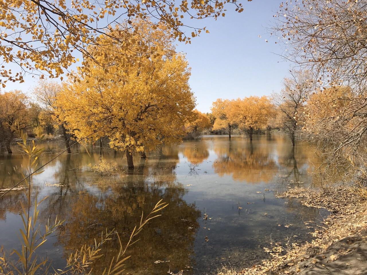 金塔胡杨林位于甘肃省酒泉市金塔县城以西的潮湖林场,为三北防护林体系的一部分。那里有着上万亩胡杨林,金秋十月的胡杨,绿色的树叶有的已经变黄,已经变黄的胡杨树,在湛蓝的天空下,在荒芜的沙漠中如阳光一般明媚灿烂。