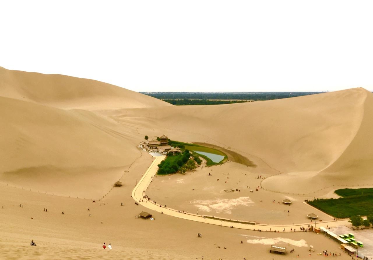 “晴空万里蔚蓝天,美绝人寰月牙泉。银山四面山环抱,一池清水绿漪涟!”澄黄的鸣沙山和清澈的月牙泉泉水相互依存,那奇异迷人的景色延续千年不变。