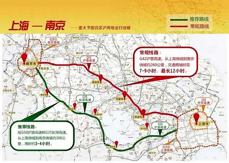 常规路线:G42沪蓉高速。从上海绕城到南京绕城约260公里,交通拥堵时需7-9小时,最长12小时。